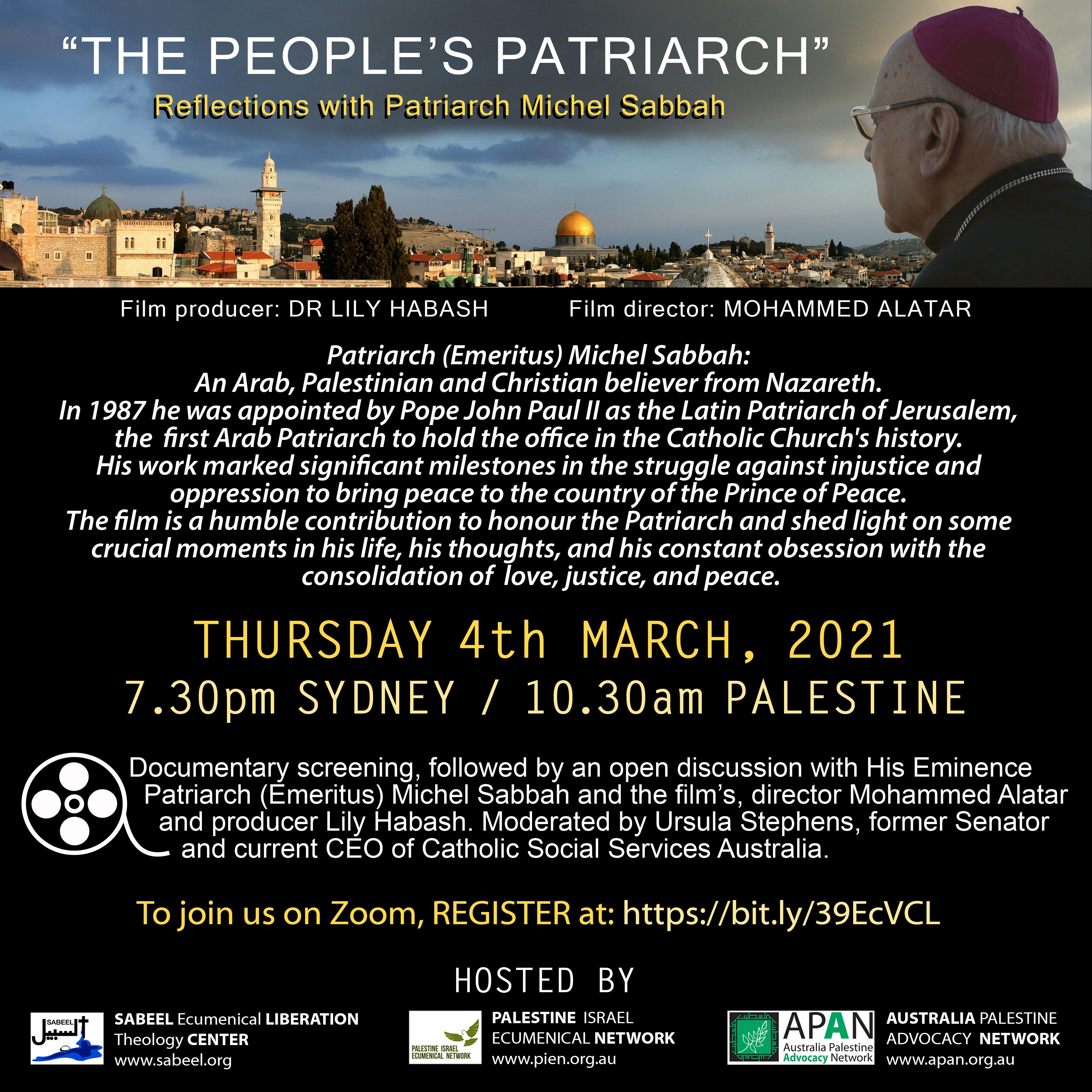 Sabeel Ecumenical Liberation Theology Centre, the Australia Palestine Advocacy Network and Palestine Israel Ecumenical Network (PIEN) invite you to the Australian launch of the film “The People’s Patriarch”, Reflections with Patriarch Michel Sabbah.
