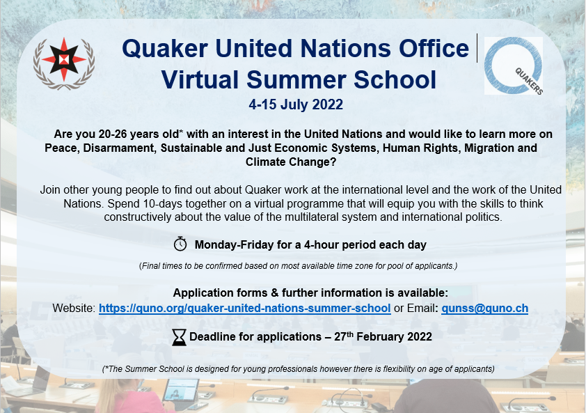 QUNO appreciate you sharing the Quaker - Virtual Summer School flyer through your networks and communication channels.