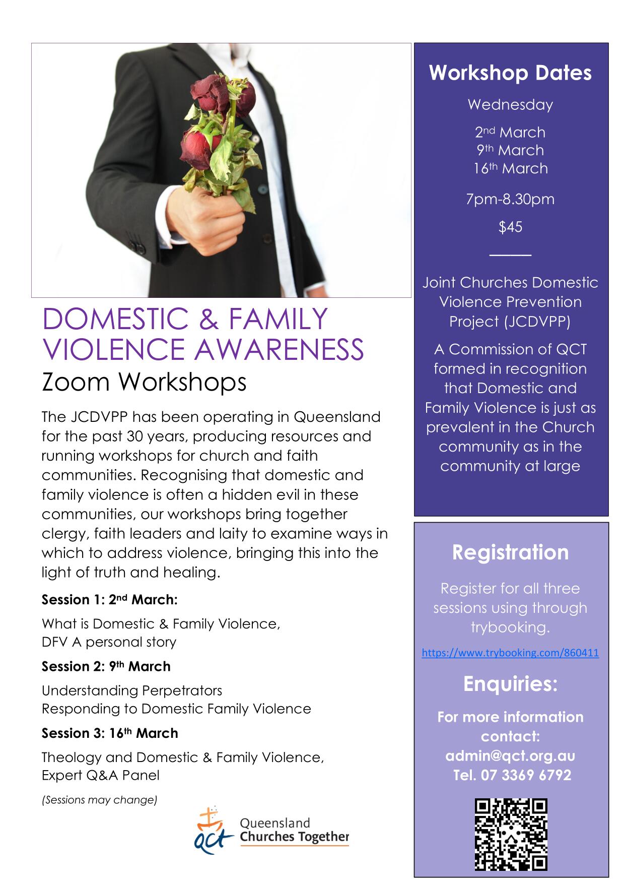 Queensland Churches Together (QCT) are again holding an online Domestic Violence Awareness Workshop series. Workshops are aimed at clergy, faith leaders, chaplains, pastoral carers and all who would like to know more about Domestic Family Violence and how to support victims of DFV.