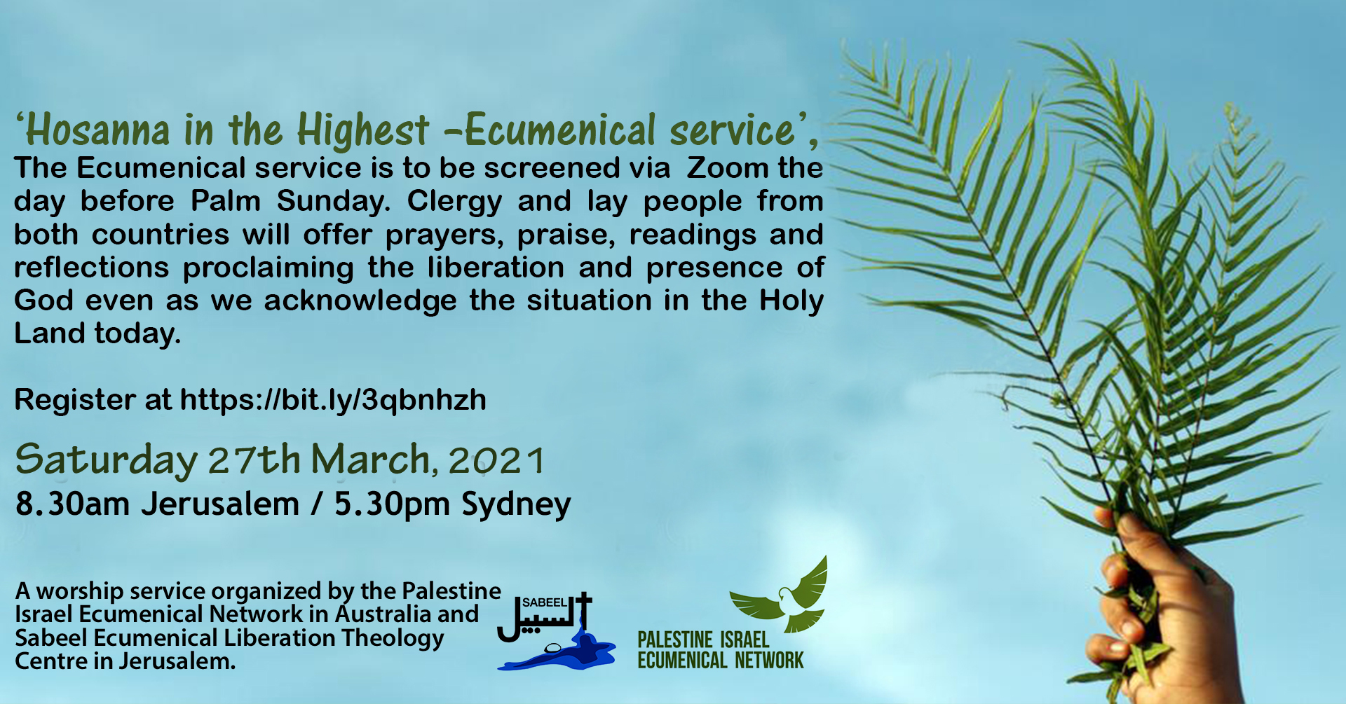 This this joint Ecumenical service event is organised by The Palestine Israel Ecumenical Network in Australia and Sabeel Ecumenical Liberation Theology Centre in Jerusalem.