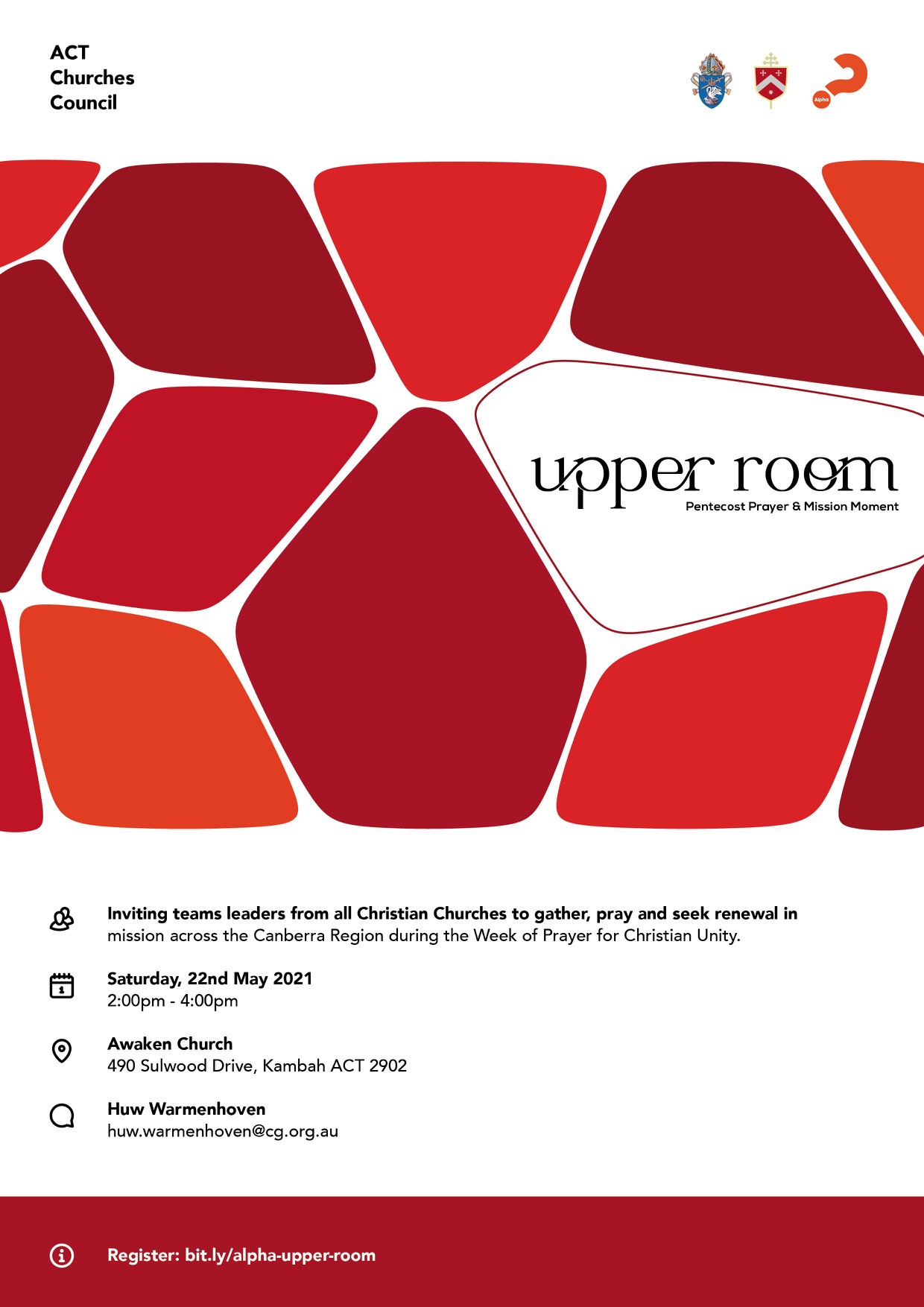 The Upper Room event on Sat 22 May is part of Archbishop Christopher and Bishop Mark’s joint Alpha initiative, which is also co-sponsored by the ACT Churches Council.